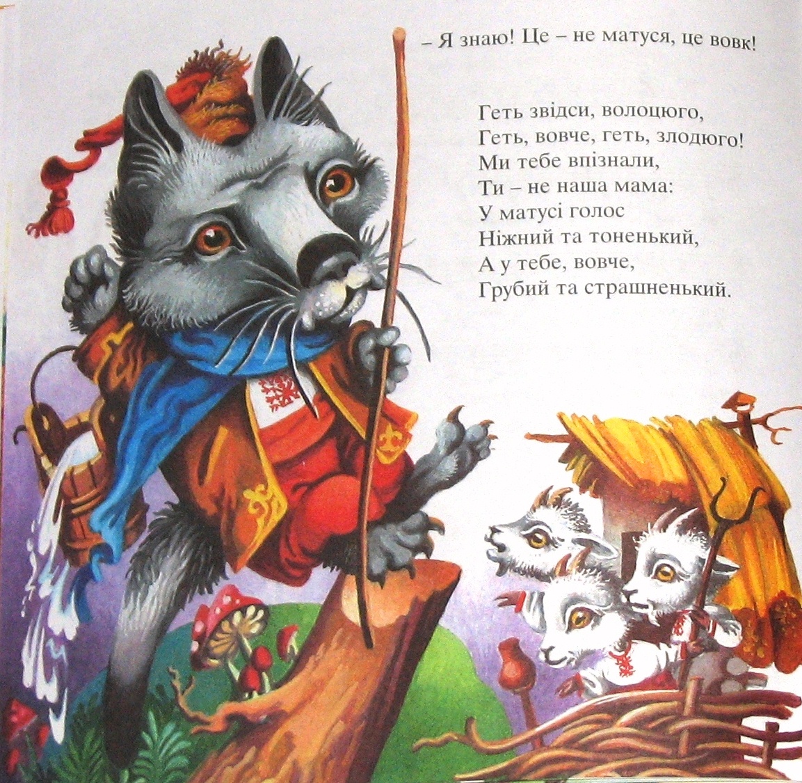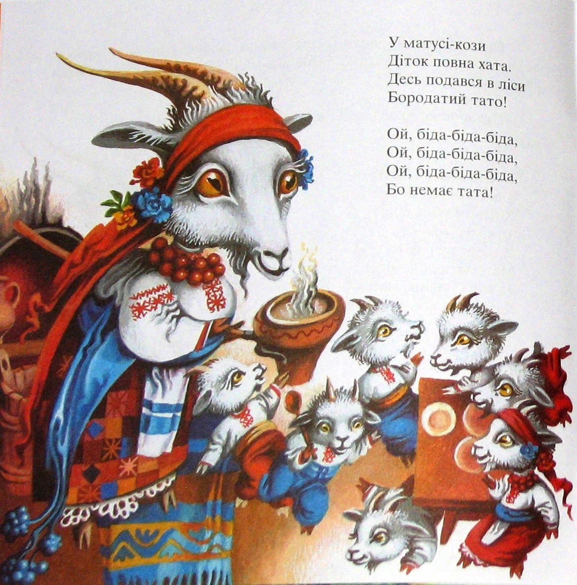 — Тільки мені двері відчиняйте, більше нікого не впускайте. Коли я прийду, то заспіваю: «Дівчатка і хлоп’ятка, мої козенятка, ваша матуся прийшла, молочка принесла».