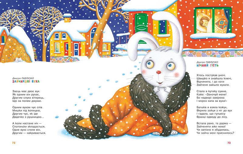 Уночі малюку снився ліс, повний пишно оздоблених дерев. Мабуть, ялинок. Довкола веселяться звірі і птахи. Лишень білченя самотньо сидить у гнізді. Ніхто не кличе його на різдвяне свято.