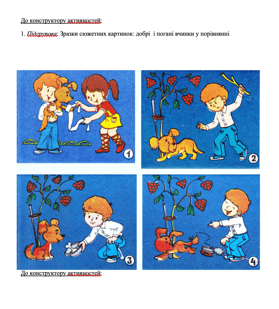 1. Підгрупова: Зразки сюжетних картинок: добрі і погані вчинки у порівнянні